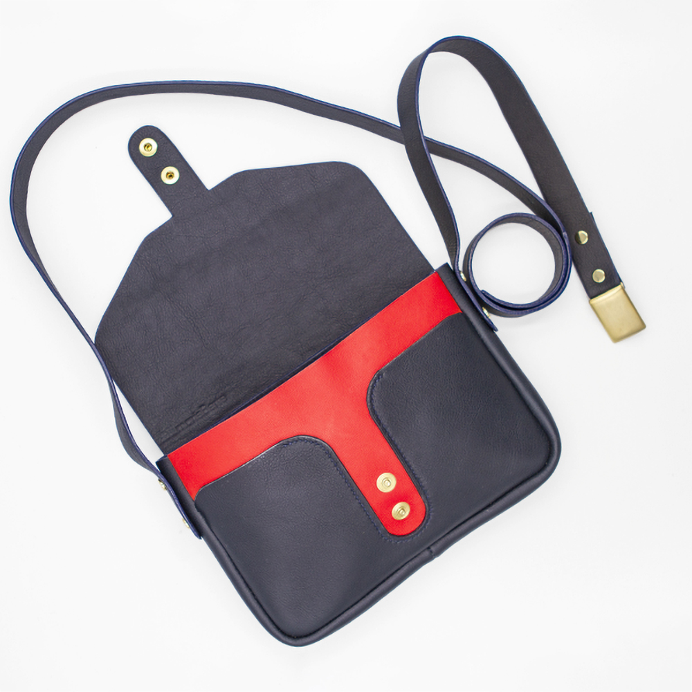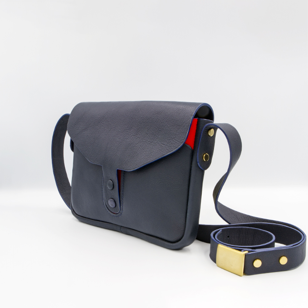 Fermeture du sac par un rabat avec deux boutons-pression gainés de cuir.